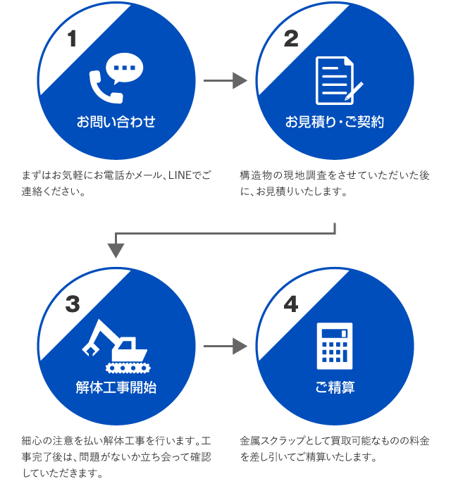解体工事にて発生しました金属スクラップは、リサイクル原料ととして買取をいたしますので構造物解体にかかるコストを大幅に削減することが可能です。
